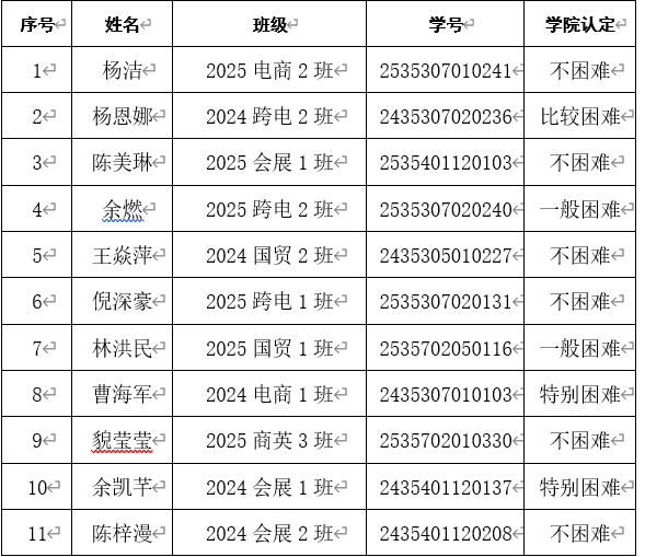 为进一步做好我院2026年春季学期家庭经济困难学生认定工作,切实保障国家和学校的各项资助政策和措施真正落实到家庭经济困难学生身上,根据《广东省教育厅等六部门关于印发《广东省家庭经济困难学生认定工作实施办法》的通知》(粤教助〔2023〕2号)、《伟德国际victor1946家庭经济困难学生认定工作实施办法》等文件精神,结合学校实际,经学生本人申请(共11名学生)、班级认定小组、学院认定工作组,结合学生综合情况,现将我院2026年春季家庭经济困难学生认定结果公示如下:
