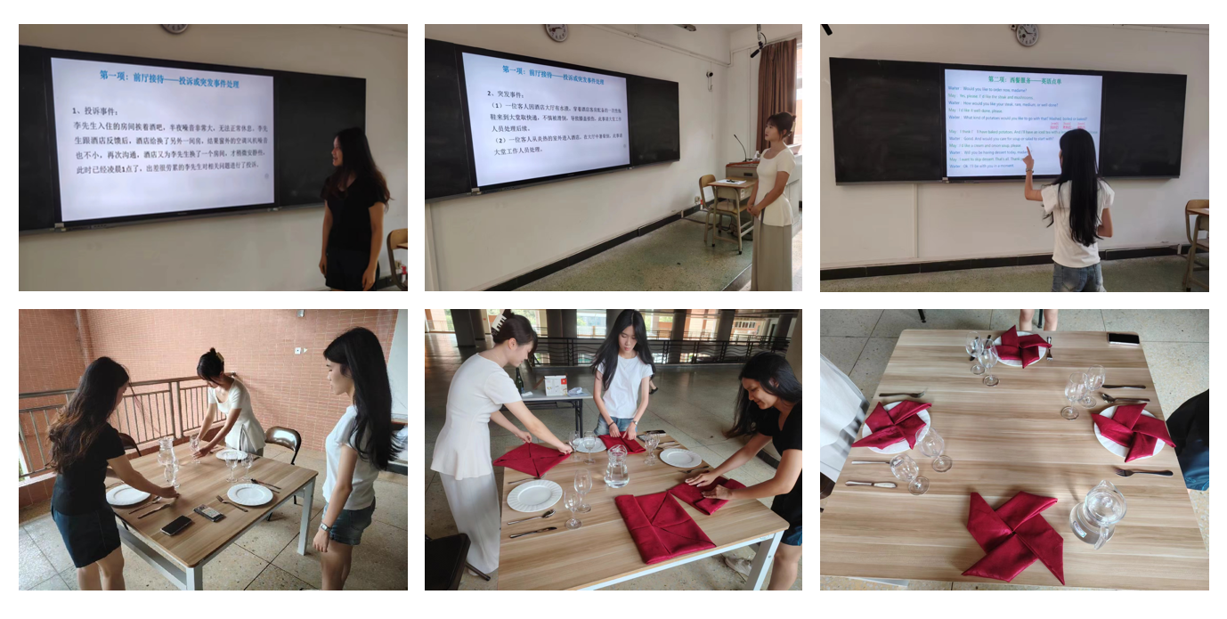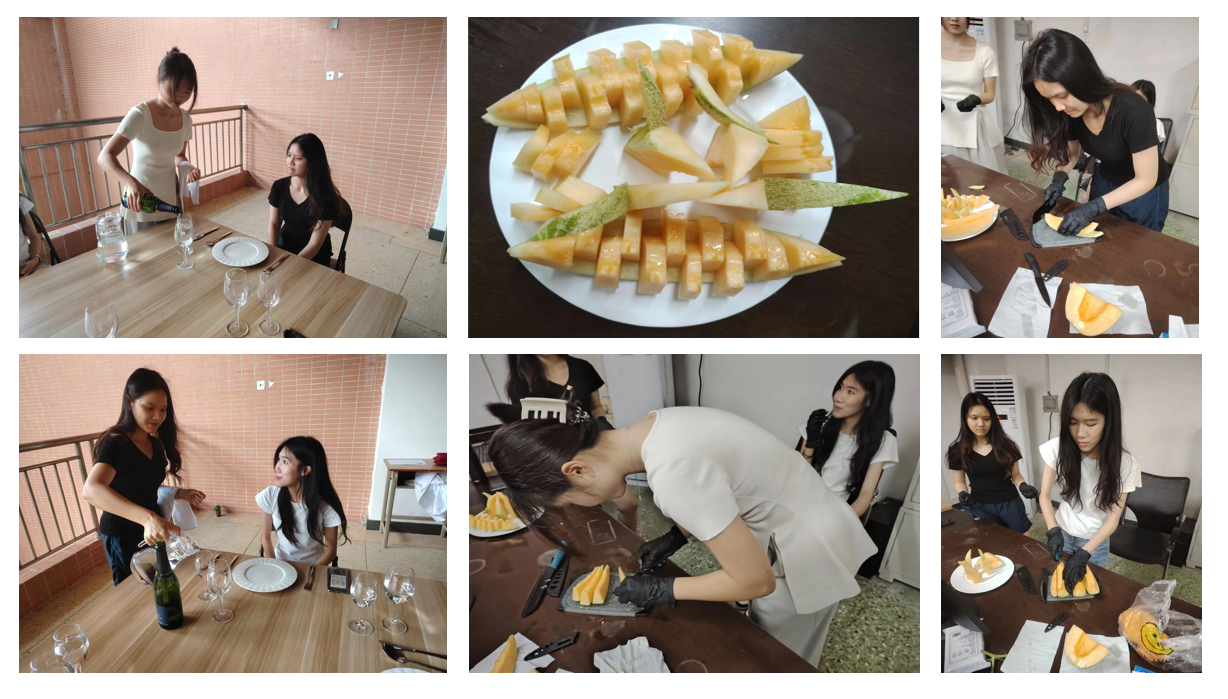 根据省技能大赛的规定,比赛共分为五个项目:前厅接待(处理投诉或突发事件)、西餐服务(英语点单)、西餐服务(摆盘服务)、西餐服务(酒水服务)以及中餐宴会服务(果盘制作)。这五项比赛内容有效地考察了学生的观察能力、动手制作能力、英语能力和处理突发事件的应变能力。