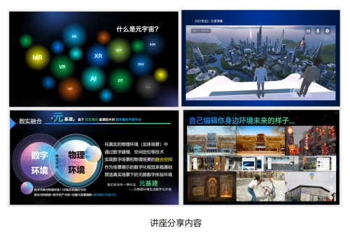 张颖真首先对自己和公司基本情况做了简单介绍,随后提出“元宇宙是什么”这一问题来展开讲座内容。通过结合视频案例,张颖真分别从三个方面介绍了“元宇宙的基本概念”、“元基建有哪些功能”和“元基建的实践任务”,充分地向大家展示了元宇宙、元基建在未来可能应用到的场景:包括党建思政、安全教育、文化建设、实践教学、创新创业等等。她还通过“相互混合,相互构建”的案例解析,以生动有趣的方式带领大家想象了一个可以自由“编辑”周围环境的未来世界。