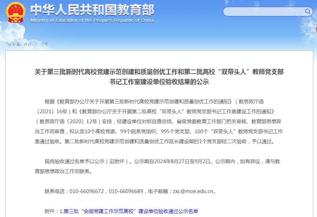 8月27日至9月2日,教育部思想政治工作司公布了第三批新时代高校党建示范创建和质量创优工作建设单位验收结果,我院教师第一党支部顺利通过“全国党建工作样板党支部”验收。