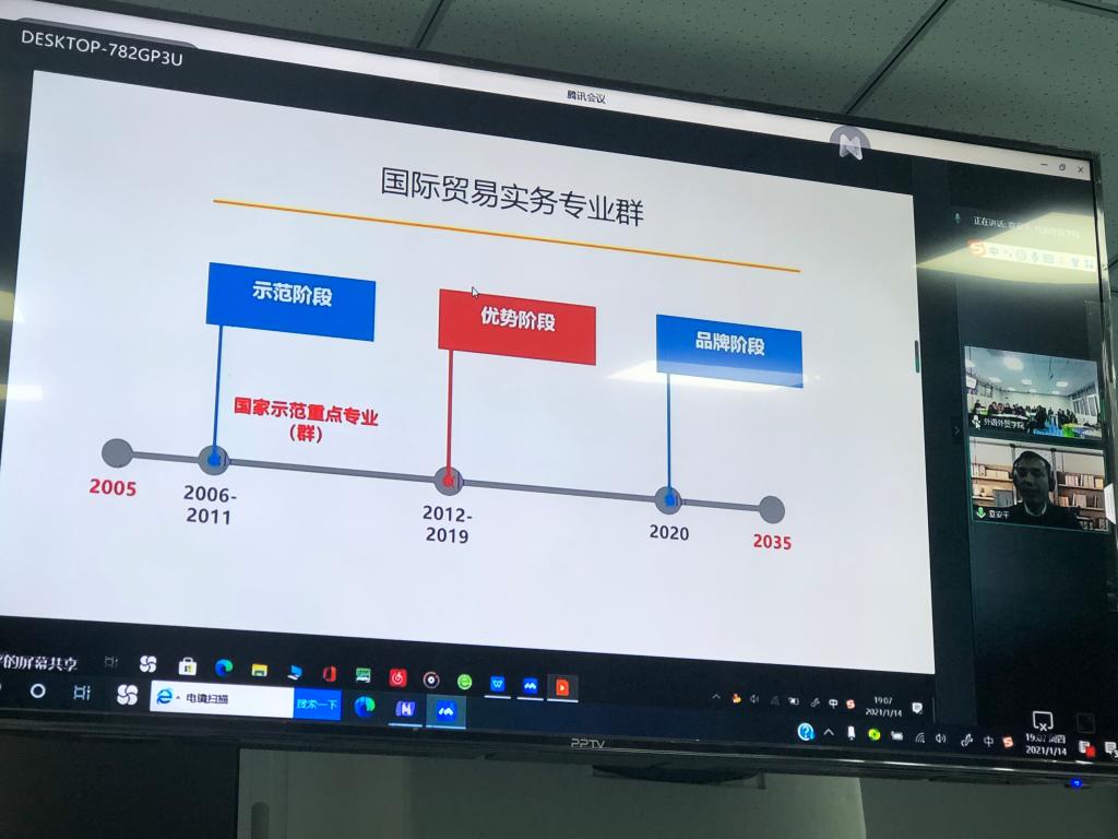 1月14日晚,为贯彻落实新时代执教20条关于“高水平高等职业学校和骨干专业群”建设方针,提升我院国际经济与贸易专业群建设内涵,将我院国际经济与贸易专业群打造为省内高水平专业群,特邀请了浙江金融学院国际贸易实务国家级高水平专业群负责人、国家“万人计划”教学名师、国家“外贸单证行业岗位”标准开发者章安平教授来我院开展“高水平专业群设计与建设”线上专题讲座。外语外贸学院国贸教研室、商务英语教研室、商务日语教研室以及电子商务教研室全体教师聆听了讲座,讲座由副校长兼外语外贸学院院长李志强主持。