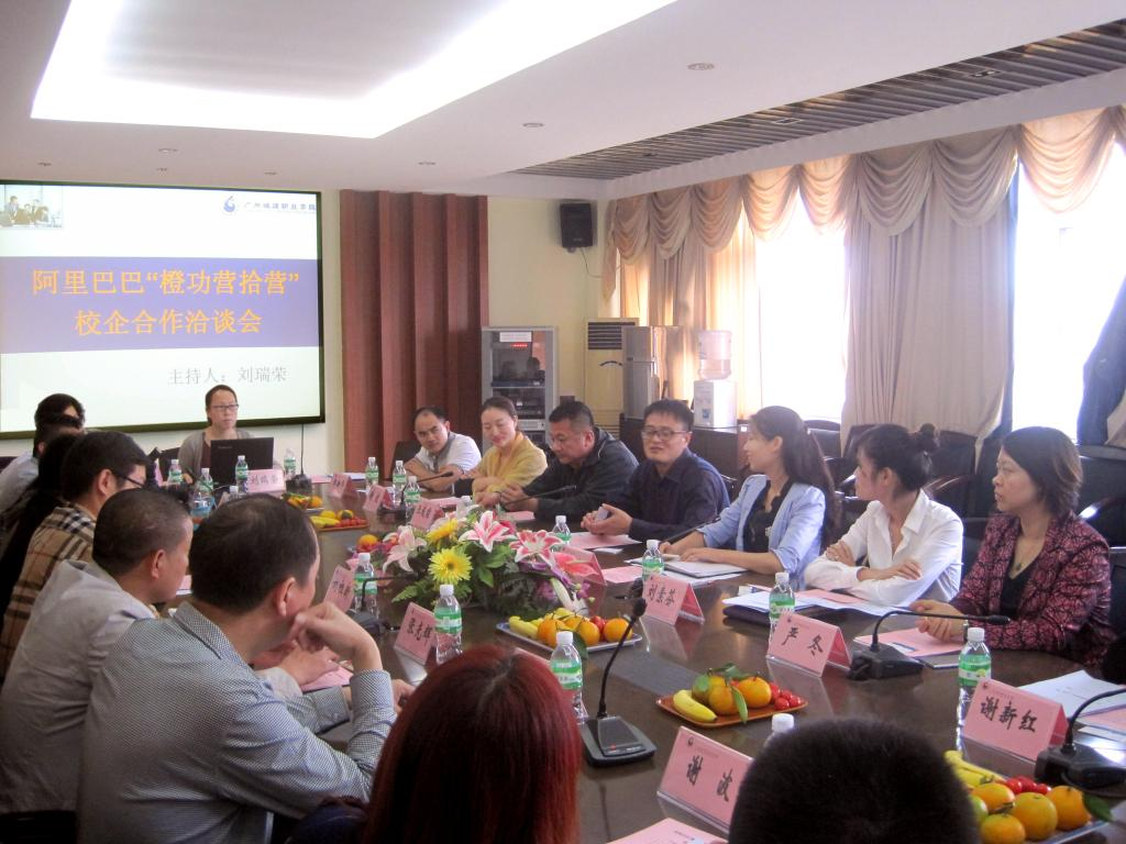 2014年11月6日下午,外语外贸学院国贸教研室主任刘瑞荣邀请了阿里巴巴“橙功营拾营”(共18家企业老总)来校洽谈校企合作事宜。院长李志强、国贸教研室副主任崔蕾以及国贸骨干教师、商英教研室主任周银新参加了本次洽谈会,会议由刘瑞荣老师主持。