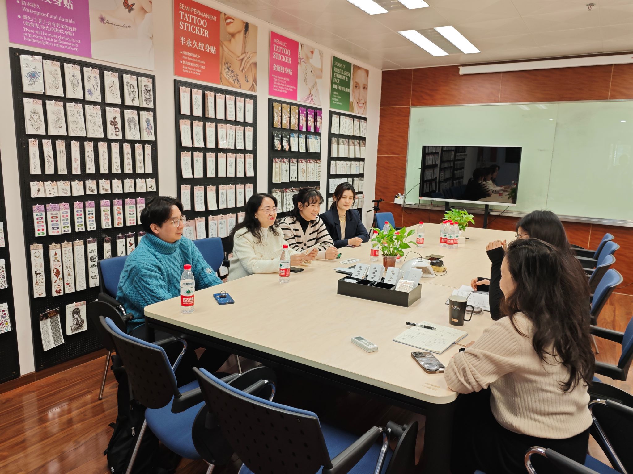在随后的交流中,双方就校企合作的具体细节进行沟通和交流。谢金荣指出,高职院校的人才培养离不开校企合作、产教融合,同时高职院校也有服务地方区域经济发展的重要职能,本次参与的几位教师分别在不同领域有着深厚的专业背景,根据企业的需求,为企业提供技术服务。尚玥表示在学校举办以XT美甲贴品牌为主题的新媒体创作大赛,学生们可以以企业冠名,针对品牌进行创意创作,提升企业品牌影响力。孙静提出可以充分利用学校的直播场地和设备,组织学生直播团队开展美甲等产品的带货直播活动,为企业和品牌带来流量和销量。陈兰兰讲到企业提供货源和供应链支持的前提下,可以指导学生在各大电商平台开设线上店铺,实施店铺矩阵,进一步扩大品牌的线上影响力。袁冠聪建议,针对企业的出海战略,可以通过跨境电商平台为品牌产品进行国际化运营,拓展海外市场。
