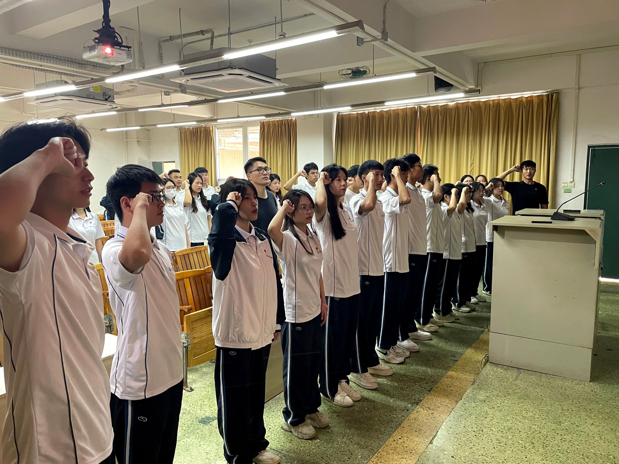 随后,学生第一党支部书记邹鹏同志给3名新接收的预备党员佩戴党徽,并带领全体党员面向党旗进行了庄严的宣誓。本次的通表大会程序严谨,严格按照发展党员的相关规定进行。
