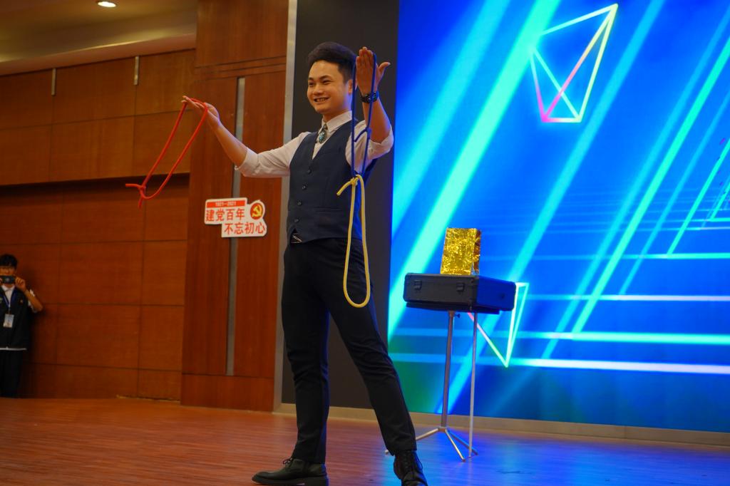 在10个团支部汇报结束后,特邀嘉宾15旅管毕业生连海铭给我们带来了不可思议的魔术表演,精湛娴熟的手法、神乎其神的变幻,将大赛现场氛围推向了高潮,全场欢声雀跃。