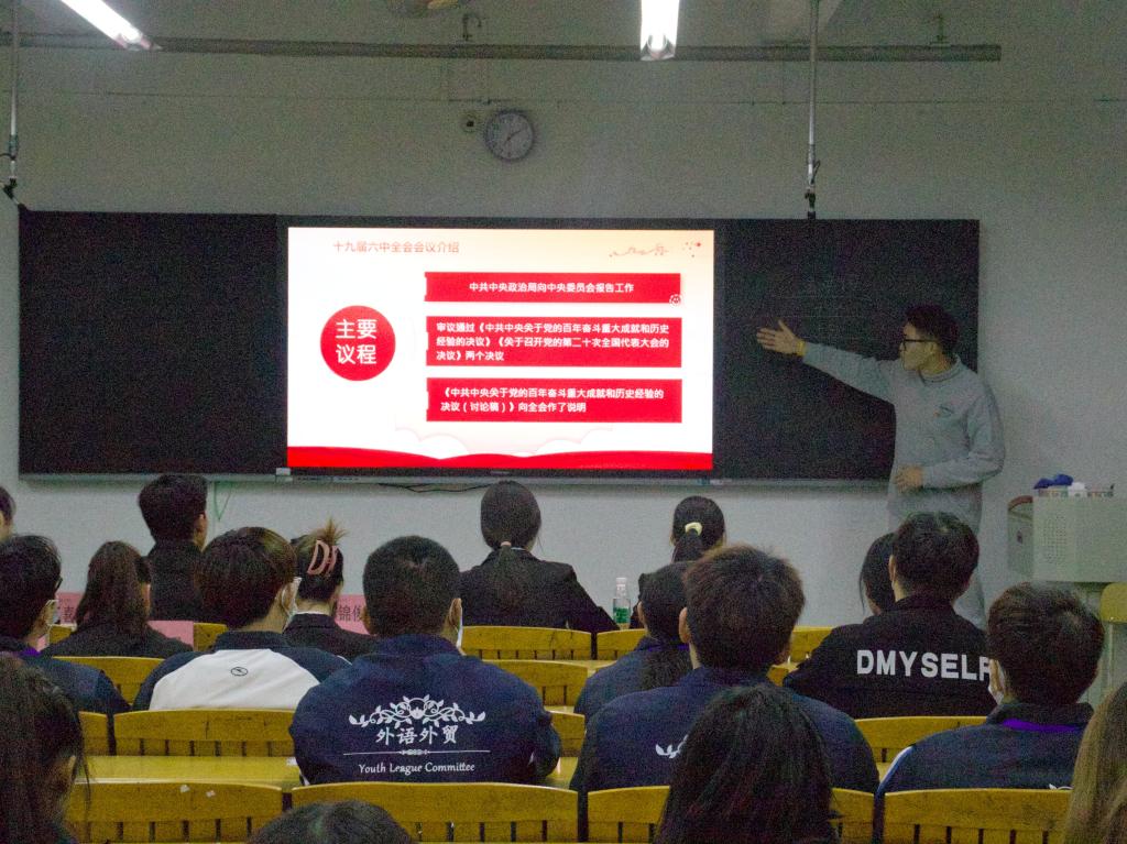 会议伊始,孙锦俊带领全体团学干部学习了党的十九届六中全会精神,他深入阐明总结党的百年奋斗重大成就和历史经验的重大意义,重点讲解党的百年奋斗的初心使命、重大成就、历史意义、历史经验,特别是中国特色社会主义进入新时代的历史性成就和历史性变革等内容,详细解读以史为鉴、开创未来的重要要求,围绕从党的百年奋斗历程中汲取智慧和力量进行系统论述。