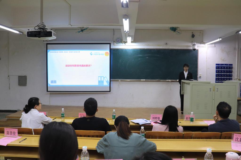 530日晚,为提升大学生的求职就业能力,丰富大学生校园生活外语外贸学院在人文艺术楼205举行了第七届简历制作与模拟面试大赛。外语外贸学院党委副书记、学工副院长刘榕敏,院团委书记孙锦俊以及学工办20级辅导员们出席了本次大赛并担任评委。