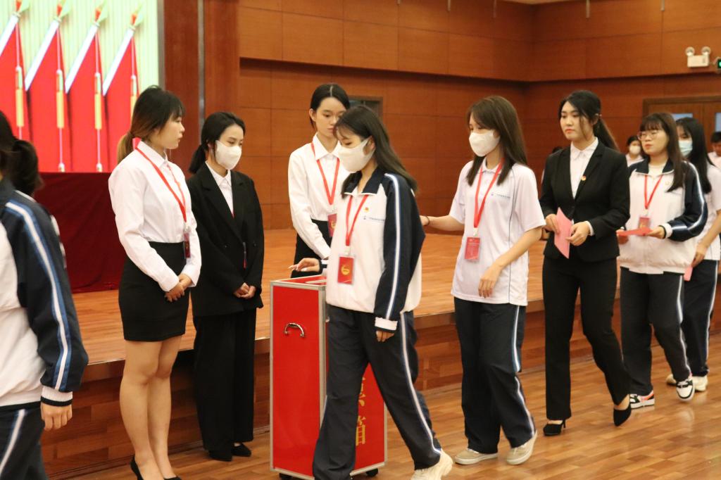 大会在雄壮的国歌声中拉开帷幕,首先由大会的主席团成员汇报预备会议的报告。刘榕敏致大会开幕词,苏思颖同学代表第六届学生会委员会做工作报告,她在报告中对第六届学生会工作进行了回顾和总结并对将要成立的第七届学生会委员会工作提出了计划和设想,该工作报告获得了全票通过。随后,大会严格按照代表大会委员选举办法及程序,经过候选人竞选演讲、投票、监票和计票四个过程,最终确认了当选的学代会委员名单。