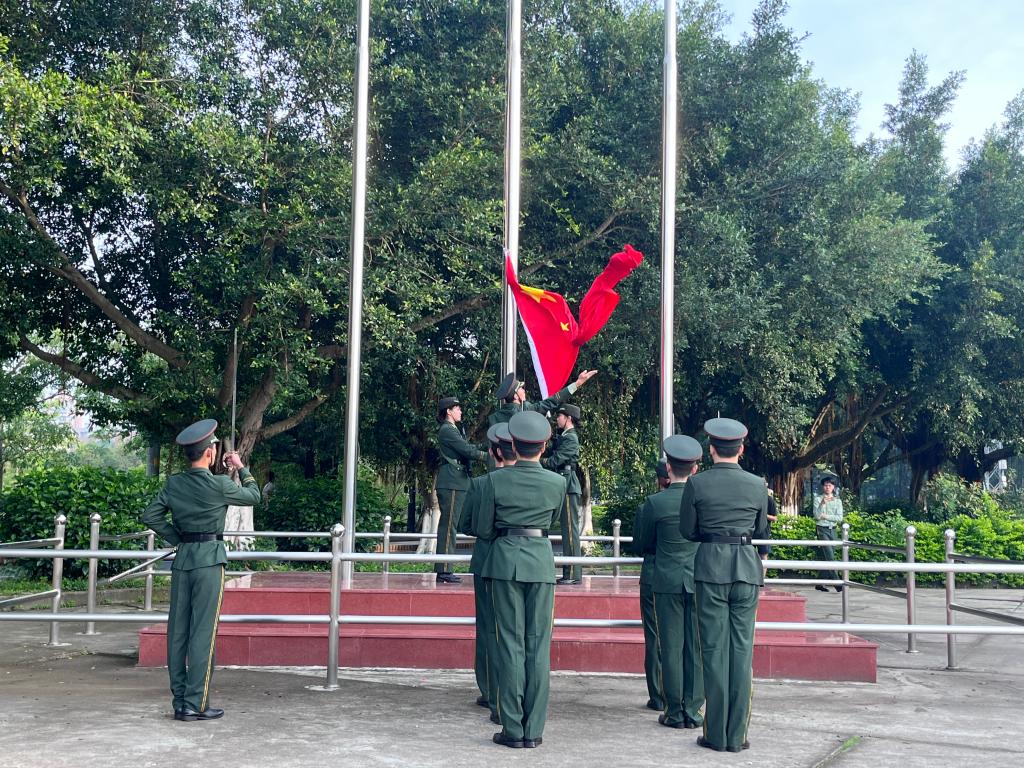 早上7点整,在激昂的《义勇军进行曲》中,升旗手振臂一挥,鲜艳的五星红旗徐徐展开,在初升的阳光映照下、全院师生的注目中,迎着初升的太阳,在晨曦中迎风飘扬在城建学院上空。
