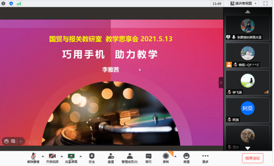 国际经济与贸易课程组的李雅茜老师分享主题为“巧用手机,助力教学”。教学要根据学生时刻离不开手机的现状进行分析,如何能够更好地解决学生玩手机的问题与更高效的教学,巧妙地将很多教学环节,教学内容引入电子通讯设备,并根据教学内容灵活运用超星通、得实和i博导等教学APP,使学生更积极参与教学中。万川老师则根据自己多年的教学经验进行分享,也是强调现在教学应根据学生特点进行分享,多运用现代化教学平台软件,增强每个教学环节的趣味性,这样能够让学生更加融入于教学中。