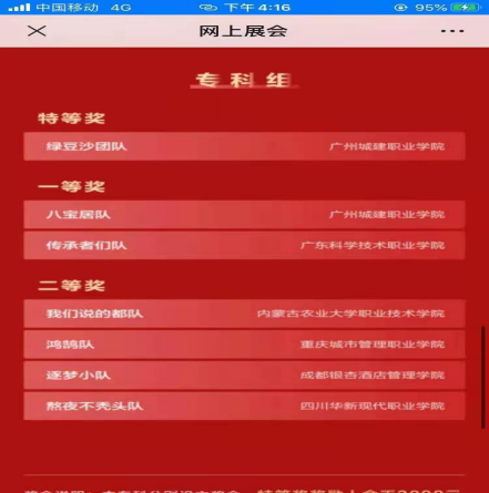 5月21日-22日,中国会展教育与科技发展论坛暨第十届“远华杯”全国大学生会展创意大赛在线上成功举办。“远华杯”全国大学生会展创意大赛一直被誉为高校会展专业最高级别的赛事。作为第一次参赛的学院,我校学生的成绩是非常喜人的。由江乐桦、邓一峰和曾煜三个同学组成的“绿豆沙团队”以95.75分的成绩勇夺“互联网+会展创意”赛项专科组特等奖;由朱雪梅、卓晓茵和骆玉汝三位同学组成的“八宝居团队”以93.75分的成绩获得“互联网+会展创意”赛项专科组一等奖。
