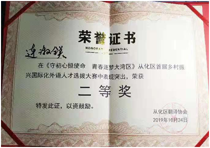 10月24日下午,由团区委、区工商联、区委组织部人才储备测评中心等联合主办,区翻译协会承办的“守初心担使命,青春逐梦大湾区”——从化区首届乡村振兴国际化外语人才大赛决赛在从化图书馆举行,我校外语外贸学院派代表参加比赛。