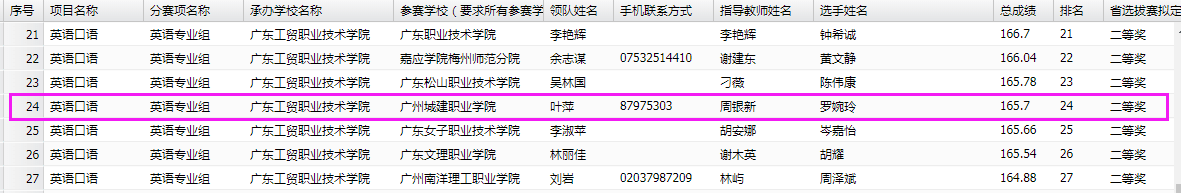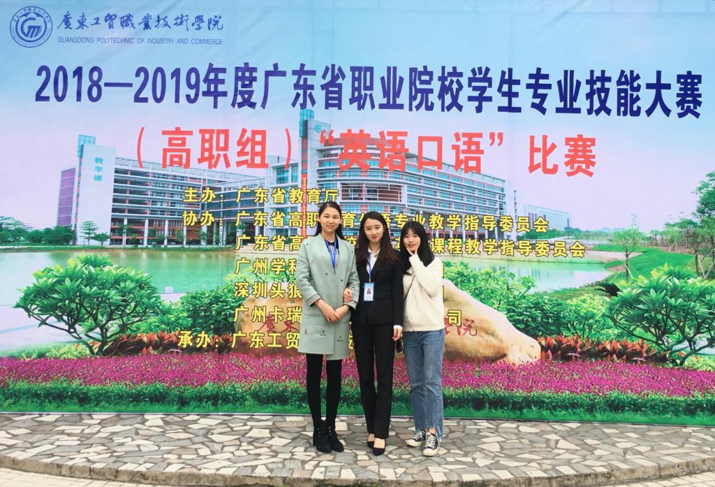 1月12-13日,2018-2019年度广东省职业院校技能大赛英语口语大赛在广东工贸职业技术学院举行,本次大赛由广东省教育厅主办,广东省高职教育外语专业教学指导委员会、广东省高职院校公共英语课程教学委员会等协办,共有来自全省高职类83所院校参赛。经过两天的紧张角逐,我校外语外贸学院王碧华和罗婉玲同学在激烈的比赛中分别荣获广东省高职组三等奖和二等奖的佳绩;叶萍老师和周银新老师荣获优秀指导教师称号。