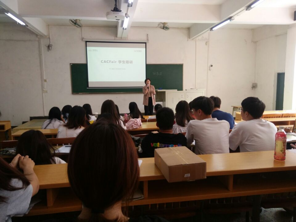 为了进一步提高学生的语言能力,加强学生的现场服务能力, 10月24日下午,广州益武国际展览有限公司林欣经理到我校为外语外贸学院参加2019秋CACFair社会服务项目的28名实习生进行岗前培训。
