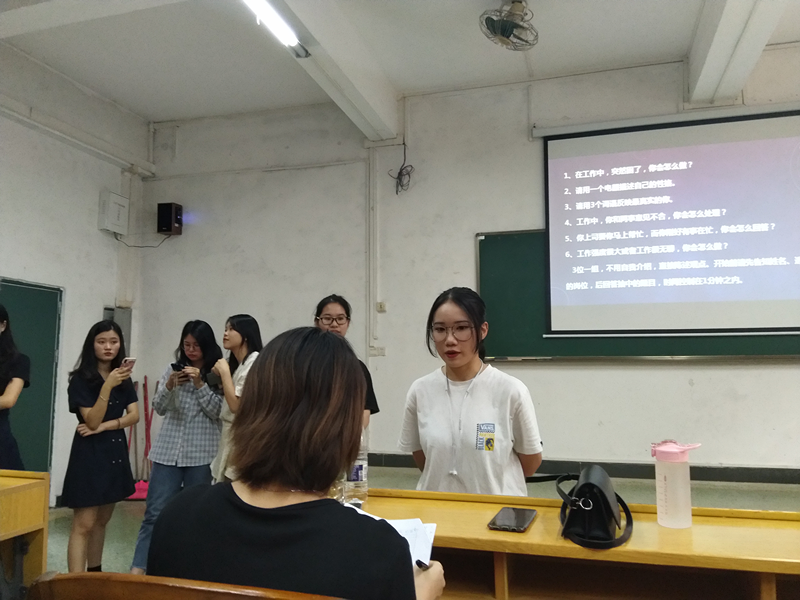 林欣经理详细地介绍了该公司的历史与实力、本次实习招聘的岗位和要求、实习生的待遇,现场回答了同学们的有关疑问,然后对有意向去该公司实习的同学进行了一轮认真的面试。约有100名18级会展专业的学生参加了本次面试。