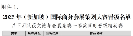 在刚刚落幕的2025年(新加坡)国际商务会展策划大赛中国地区选拔赛暨第十八届全国高校商业精英挑战赛文旅与会展创新创业实践竞赛中,会展策划与管理教研室派出的三支参赛队伍(会展策划赛项1支、应急沙盘演练赛项1支、教师组课程设计赛项1支)均荣获一等奖,其中应急沙盘演练队伍更是以卓越的表现进入全国精英赛决赛,将与其他12支来自全国各地的高校队伍共同角逐前往新加坡参加国际赛的宝贵机会。