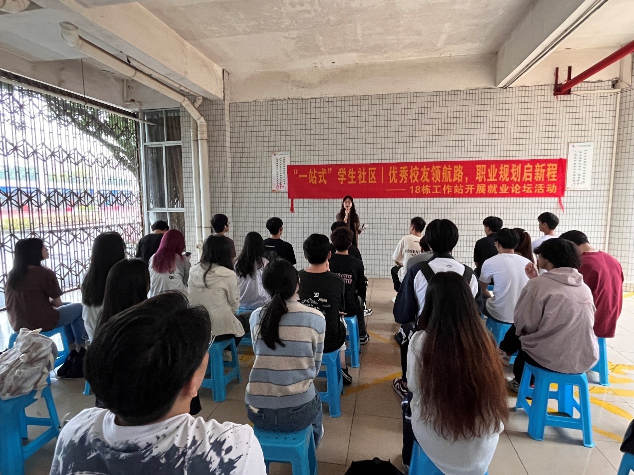 2024年11月13日,为深入贯彻学校“一站式”学生社区建设文件方案的相关要求,充分发挥优秀校友的榜样引领作用,进一步推动育人队伍进社区工作,18栋工作站在18栋学生公寓小广场成功举办了一场别开生面的就业论坛活动。活动主讲人为伟德国际victor19462016级校友庞倩容和2020级校友吴骏斌,他们带着丰富的职场经验和深刻的职业感悟走进社区,与学弟学妹们分享就业心得,共话职业规划。18栋工作站站长陈贤俊老师和50余名学生参加了此次活动。