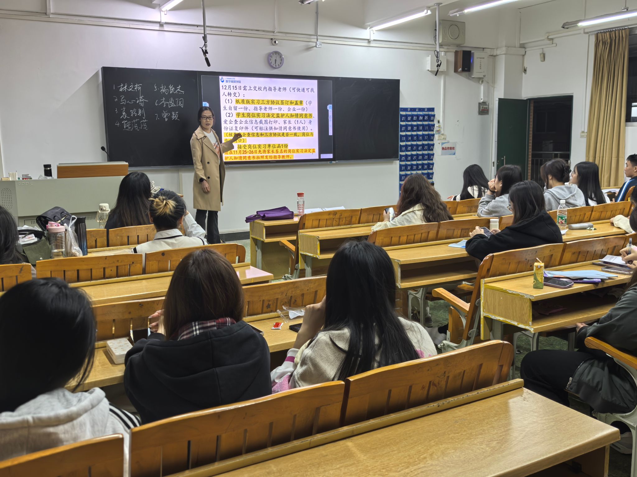 在各分会场中,负责人首先为毕业生开展岗位实习安全教育会。他们向即将毕业的学子重点阐述了岗位实习的重大意义,督促学生树立正确的就业观念和职业选择观,并对岗位实习系统的操作、实习日志的撰写以及纸质实习材料的填写等方面提出了具体要求和说明。此外,负责人还着重强调了岗位实习期间的安全隐患,包括外出实习期间的人身安全保护、财产管理以及防范诈骗的重要性;要求毕业生遵守法律法规、诚实守信,严格遵守学校和实习单位的各项规章制度,积极配合学校和单位的工作安排。