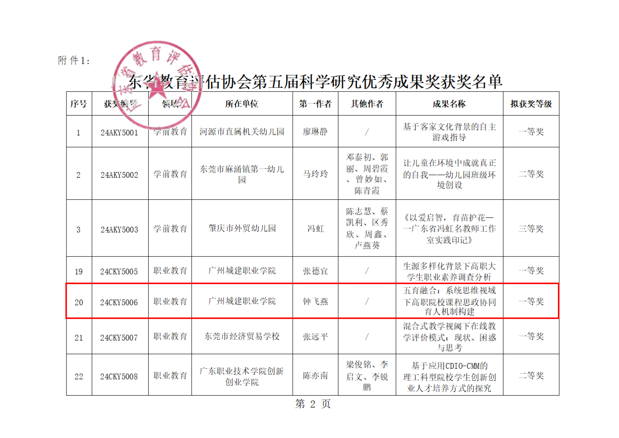近日,广东省教育评估协会第五届优秀成果奖评选活动圆满结束,经过层层筛选与严格评审,各项大奖最终揭晓。在此次评选中,我院钟飞燕教授的论文《五育融合:系统思维视域下高职院校课程思政协同育人机制构建》在职业教育类评选中荣获一等奖。