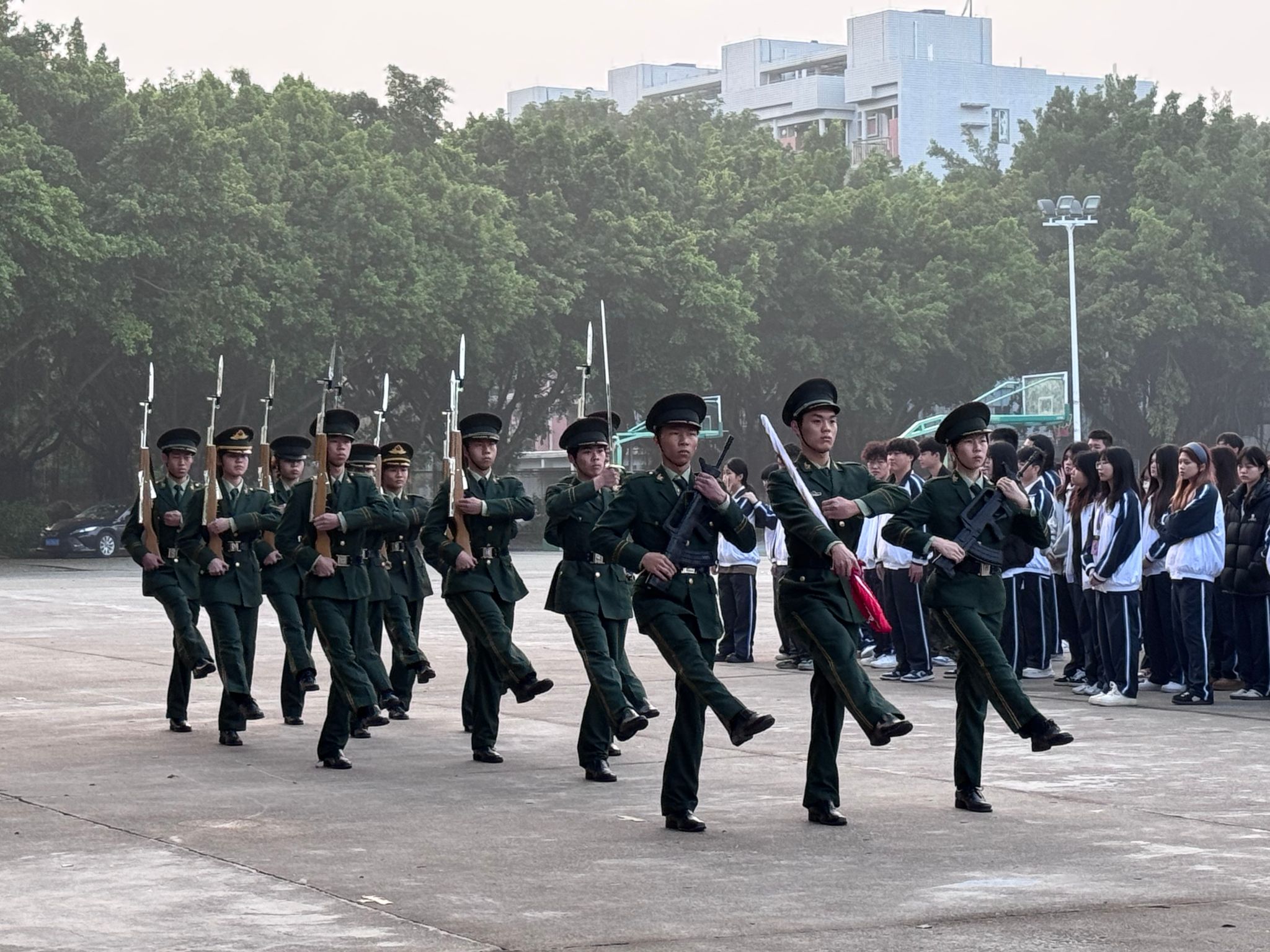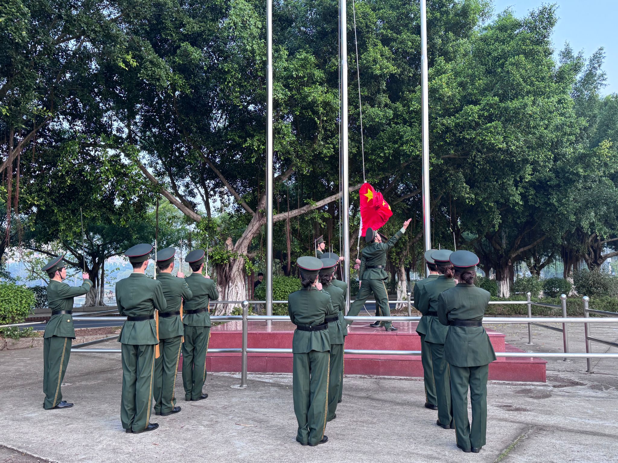 当日清晨,师生们齐聚操场。在众人的瞩目下,国旗护卫队迈着整齐有力的步伐护送国旗走向升旗台。伴随着雄壮激昂的国歌声,鲜艳的五星红旗迎着晨曦缓缓升起,在空中舒展飘扬。