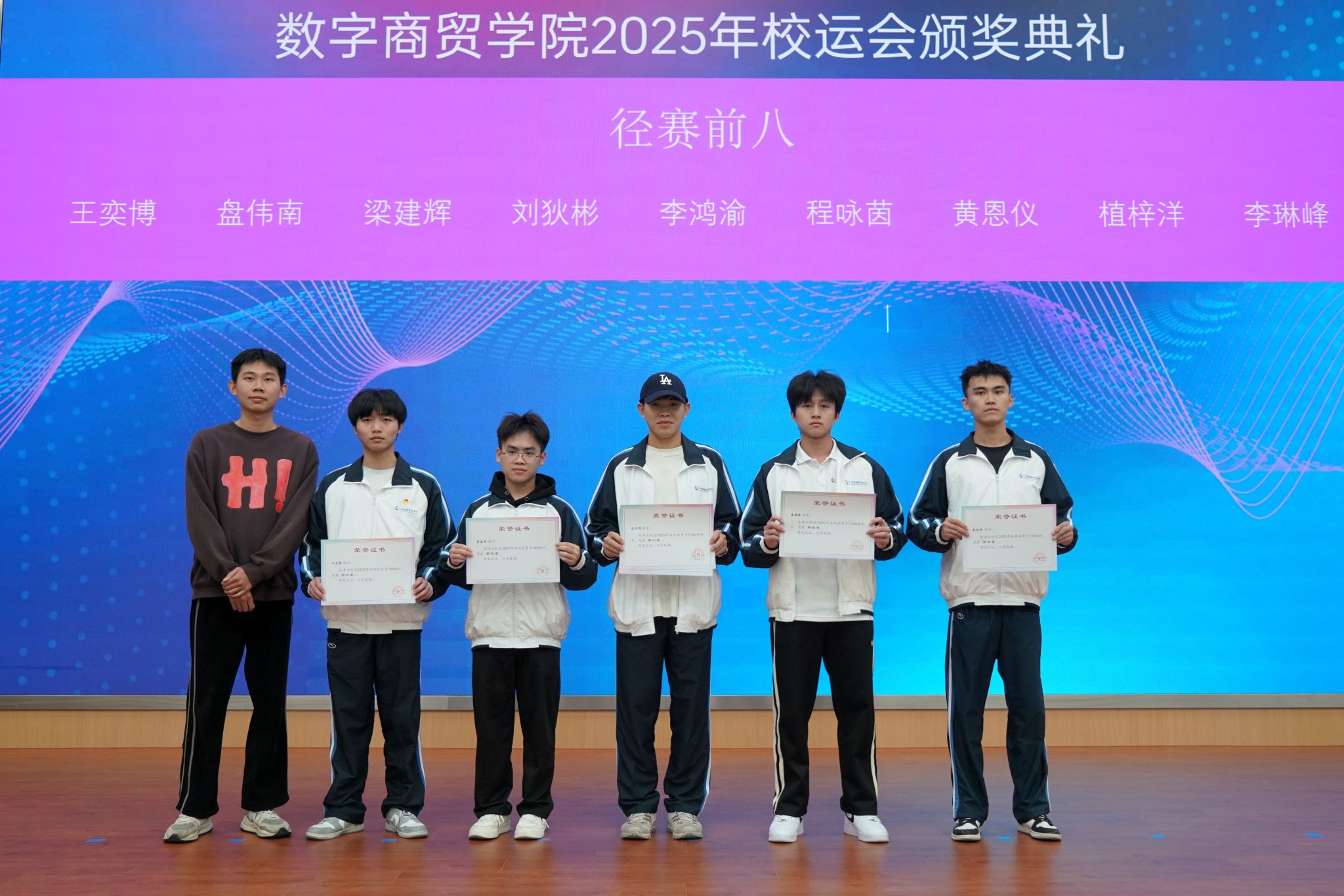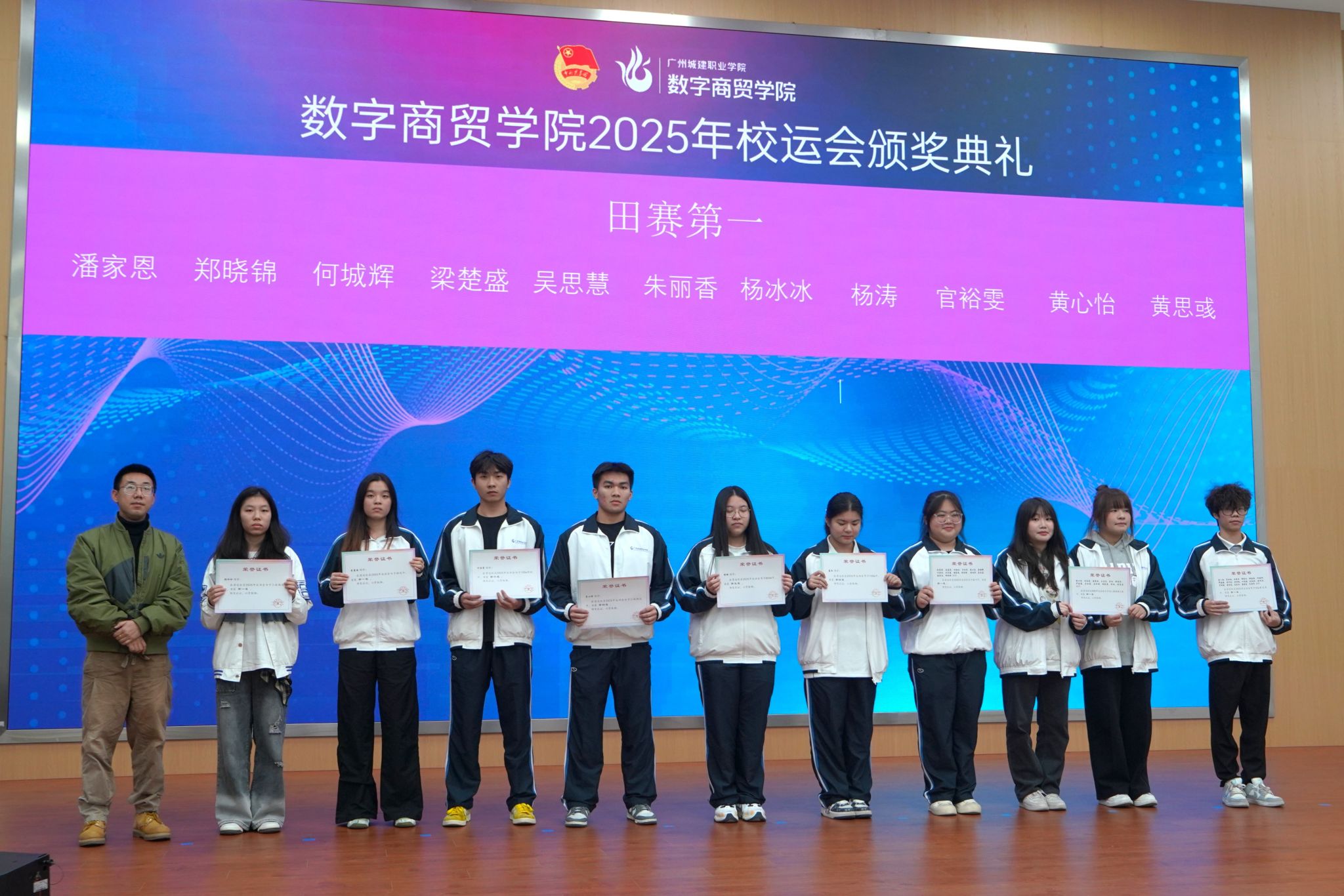 随后的校运会颁奖典礼上,学院对在 2025 年校运会中取得优异成绩的运动员进行表彰。田赛、径赛各项目获奖选手身着运动盛装依次登台领奖,他们在赛场上展现的奋勇拼搏、永不言弃的体育精神,以及取得的优异成绩,获得了全场师生的认可与掌声。